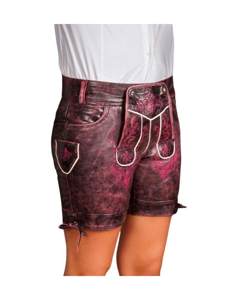 Every stitch tells a story—these leather shorts feature handmade embossed embroidery inspired by age-old Bavarian motifs. The rustic staghorn-style buttons and traditional cut make them feel rooted in heritage, while the bold berry color adds a daring, modern spirit. These lederhosen are a tribute to classic Alpine wear with a playful edge.