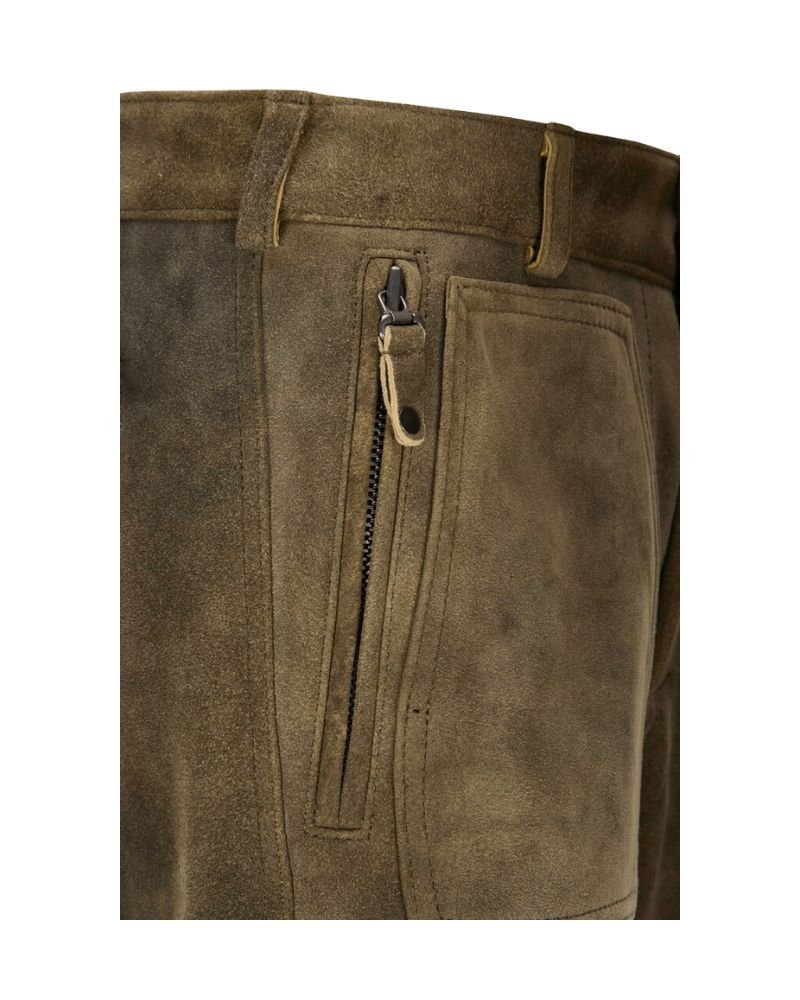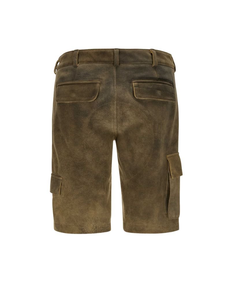 The Emil Foreststone Cargo Lederhosen delivers a fusion of classic craftsmanship and utilitarian design. Crafted in a natural blend of earthy brown and green suede, this knee-length piece offers a grounded, rugged aesthetic fit for both everyday and traditional wear.