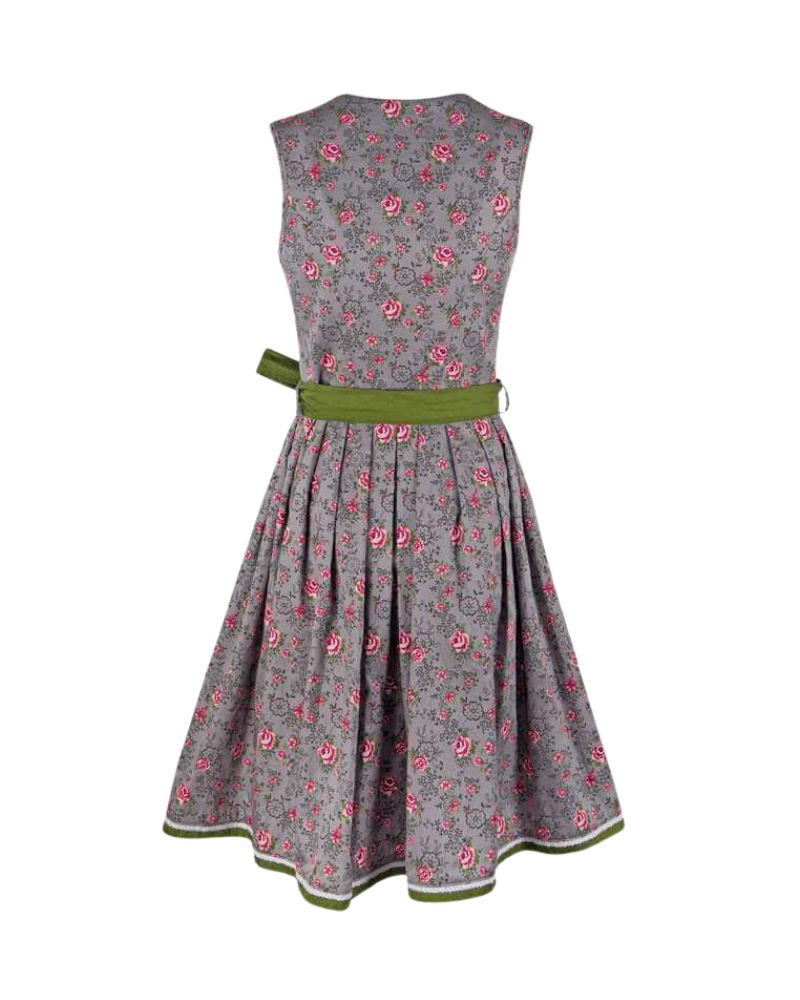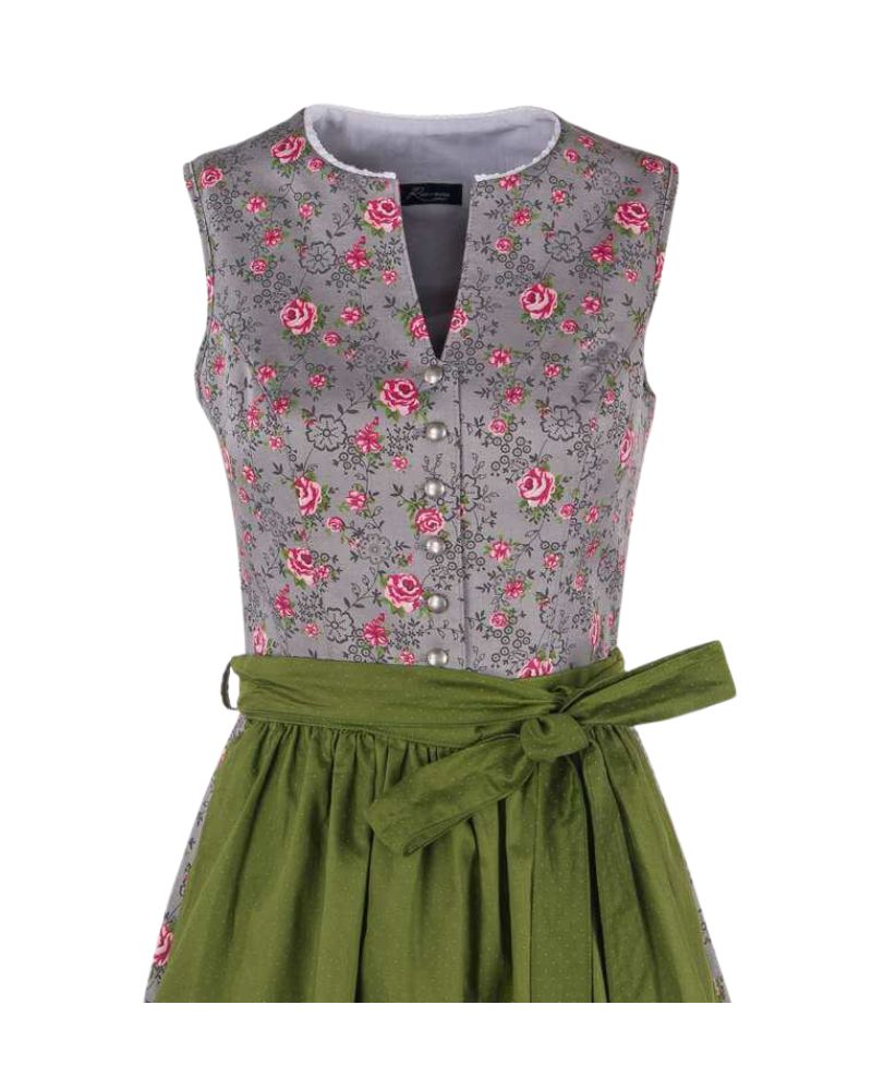 Floral motifs in the rose print and apron detailing give this dirndl its signature romantic touch. The green apron brings an earthy charm that beautifully complements the grey base of the dress. Styled with a lace blouse and traditional shoes, this outfit becomes an instant head-turner. For more floral-infused outfits, browse our romantic midi dirndl collection or explore the full range on our German Attire.