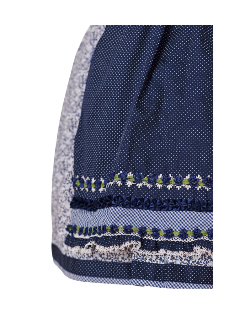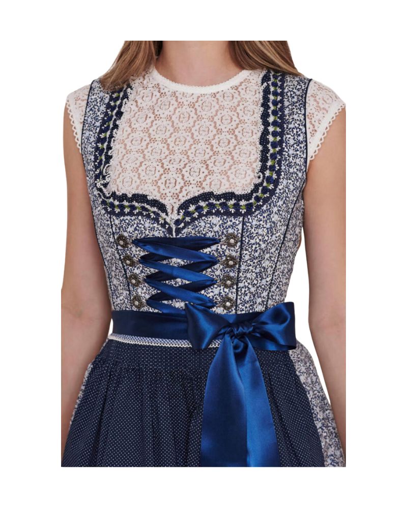 The bodice features classic corset-style lacing with satin ribbon, offering a tailored fit that enhances the waist. Paired with the coordinating blue apron, Garmisch strikes the perfect balance between traditional and trendy. The contrast of flower-dotted navy fabric against crisp white details evokes a soft countryside vibe, while still feeling refined enough for more dressed-up occasions.