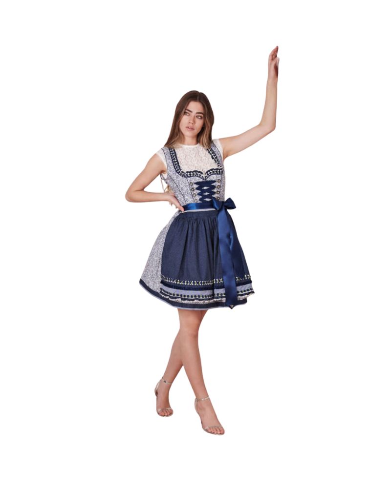 The Garmisch Dirndl celebrates Bavarian tradition with a fresh and youthful twist. Styled in navy blue with delicate white floral patterns, this mini dirndl brings a sense of joy and lightheartedness to any festivity. Whether you’re strolling through a summer fair or dancing at Oktoberfest, the shorter length and charming silhouette ensure you’ll turn heads in every direction.