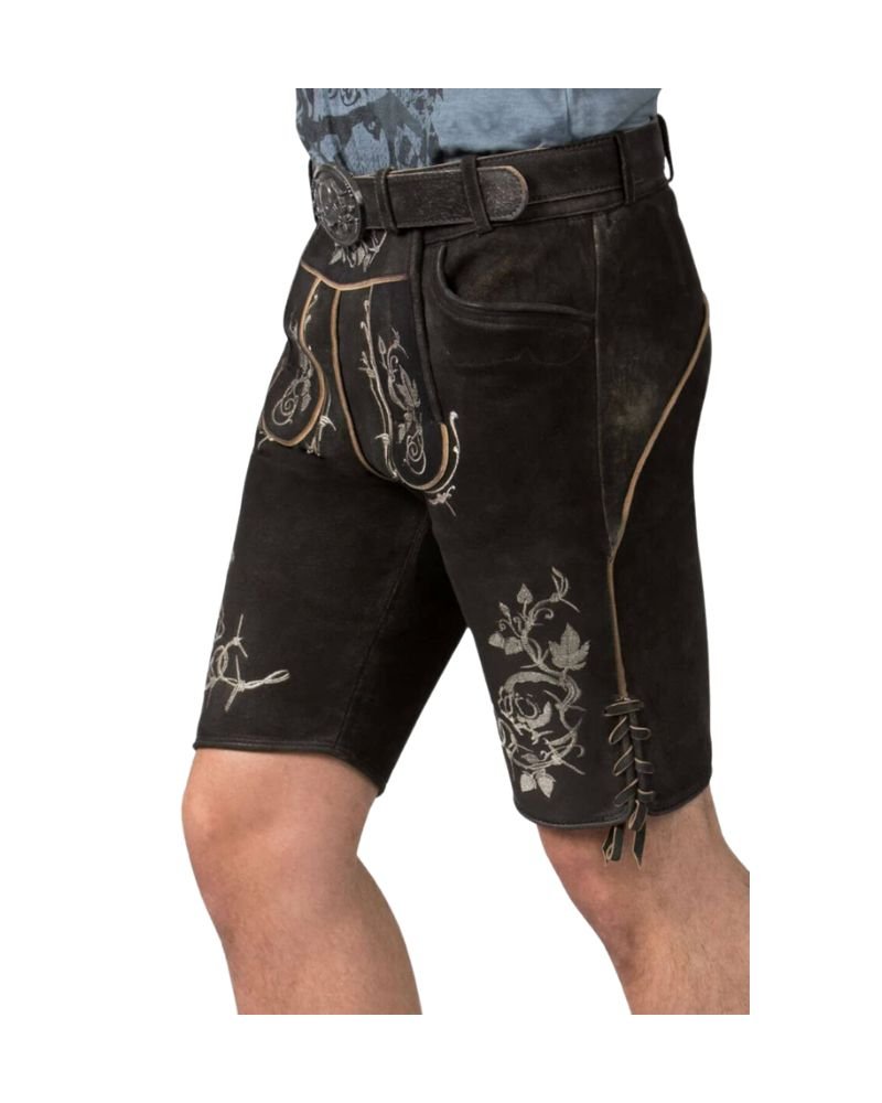 Embellished with Bavarian-style vine and foliage motifs, the embroidery gives the lederhosen a naturalistic charm that reflects the beauty of forested Alpine regions. The contrasting embroidery enhances the visual depth while honoring old-world artistry. For those drawn to darker tones with rich stitching, you might also appreciate the Regensburg Ironfog Lederhosen, a gray-toned alternative with castle-inspired embroidery.