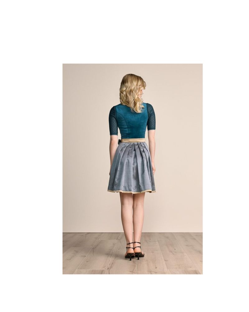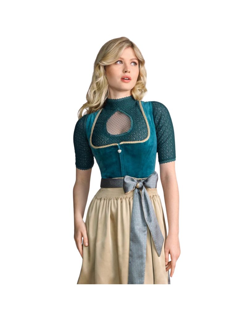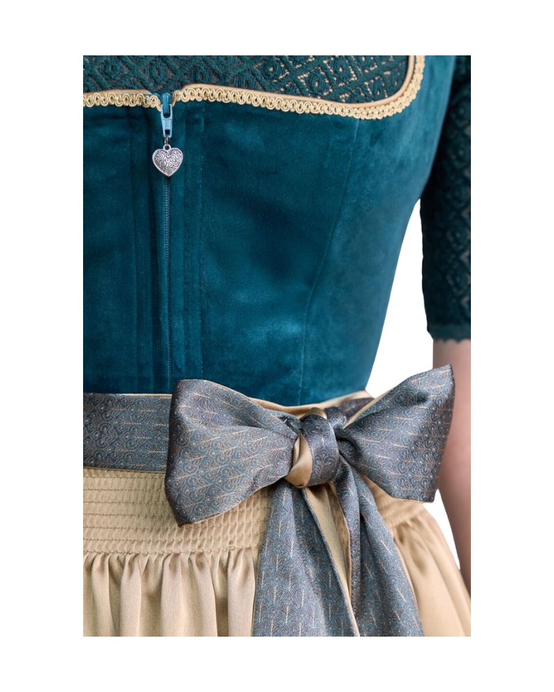 This dirndl is absolutely striking—the teal velvet bodice stands out beautifully against the soft beige apron. The fabric feels high-quality and has a slight sheen that looks incredible in natural light. The zippered front is practical but still maintains that traditional charm. A perfect blend of modern and folk style.