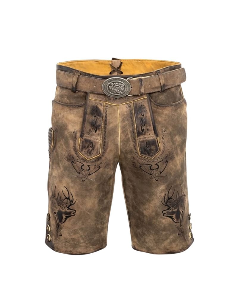 The Matthias Traditional Stag Embroidered Kurze Lederhosen showcases timeless alpine style with a masculine edge. Crafted from supple, high-quality goat suede leather, this deep brown pair offers authentic Trachten design enriched by a rustic, weathered finish. Whether you’re gearing up for Oktoberfest or dressing for a heritage celebration, these leather shorts bring tradition and strength into one unforgettable piece.