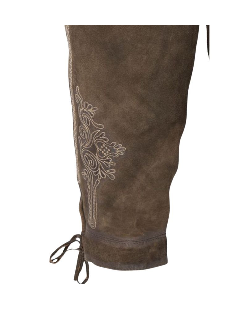 True to traditional Trachtenwear, each pair features carefully embossed embroidery crafted by hand. The subtle yet intricate motifs trace the edges and leg panels, echoing centuries of alpine artistry. Reinforced seams and detailed stitching add to their structural integrity and visual charm.